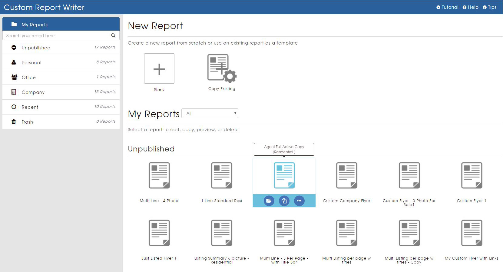 The report management page allows you to create a new report for a specific property type or multiple property types, or copy an existing report to use as a template. From this page, you also have quick and easy access to all of your existing reports, organized into different folders for your convenience.