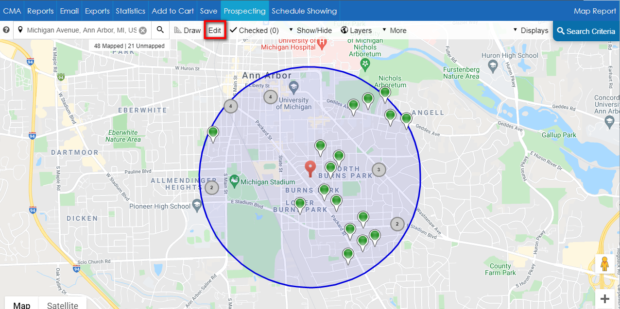 - If you wish to adjust the radius distance, click the Edit button in the map toolbar.