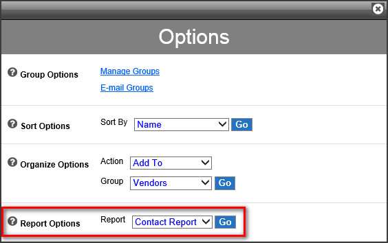 - Make sure Report Options is set to “Contact Report” and click the “Go” button.